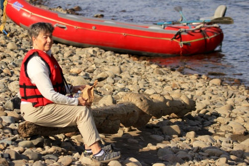 This morning we got up and had breakfast at the hotel and headed out on a rafting trip on the Klondike River. We started just outside of Dawson and floated back into where the Klondike joins the Yukon in Dawson. We were the only ones signed up for the trip so it was just one raft with us and our tour guide Sarah. She knew the river well and was very nice. Like most of the kids who work for HAL at the Westmark locations, she was here for the summer.